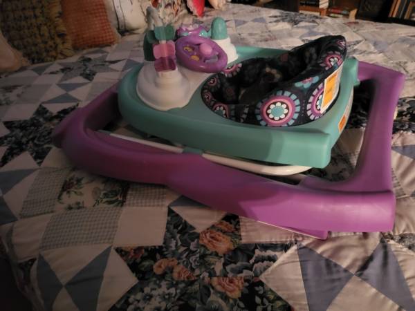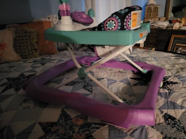 Like new Cosco baby rolling walker with locks on wheels. Collapsible for storage or transport. Steering wheel and other activity toys attached. Seat can be removed for washing in machine. All wheels work as they should. Folds to 8" high. Non smoking, no pets home. $20. Paid $50 for it a year ago.