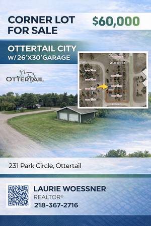 .46 Acre Corner Lot in Ottertail with Garage. Beautiful and level .46-acre corner lot in the City of Ottertail. Prime building site features mature trees and includes a 26' x 30' Garage with double doors—ready for storage or future use. Conveniently located within walking distance to Thumper Pond Golf Course, Otter Tail Lake, and several local restaurants.